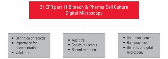 圖 1:示意圖概述了生物技術(shù)和制藥行業(yè)中關(guān)于細胞培養(yǎng)的電子記錄和簽名的 21 CFR 第 11 部分指南的基本步驟,以及數(shù)碼顯微鏡的使用。