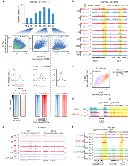 研究發(fā)現(xiàn)了H3K36me2重編程的關(guān)鍵特征。分析發(fā)現(xiàn),ZGA后H3K36me2與增強(qiáng)子標(biāo)記H3K27ac的共定位顯著增強(qiáng),相關(guān)性從1細(xì)胞期的R=0.28升至8細(xì)胞期的R=0.79(圖3a-b)。 遠(yuǎn)端H3K27ac峰在8細(xì)胞期被H3K36me2優(yōu)先標(biāo)記(圖3a底部)。使用A-485抑制P300/CBP介導(dǎo)的組蛋白乙;螅禺愋缘?fù)p害了8細(xì)胞期胚胎中H3K27ac富集區(qū)域的H3K36me2重建(圖3c-d),表明組蛋白乙酰化部分介導(dǎo)H3K36me2向增強(qiáng)子招募。但H3K36me2在植入前并未擴(kuò)散至全基因組,其限制因子尚不完全清楚,可能存在其他調(diào)控機(jī)制。