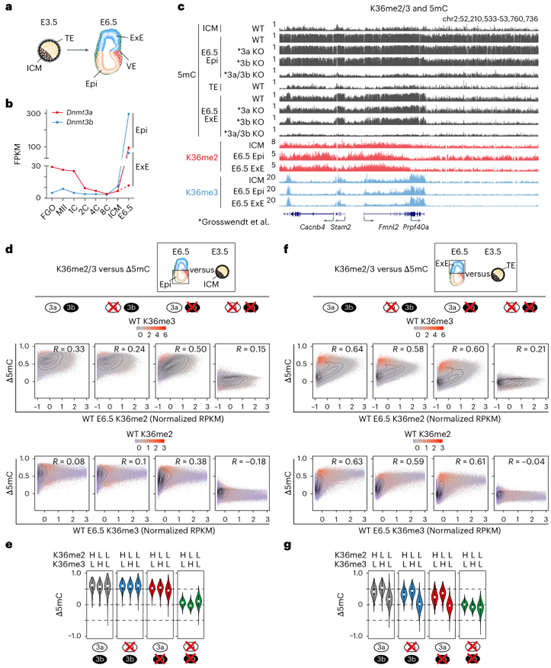 研究利用已發(fā)表的野生型及Dnmt3a和Dnmt3b敲除胚胎數(shù)據(jù),分析了H3K36me2/3與植入后DNA甲基化建立的相關(guān)性。在胚胎譜系(Epi)中中,野生型胚胎從ICM到E6.5的DNA甲基化增益與H3K36me3相關(guān)性較弱(R=0.08),與H3K36me2相關(guān)性中等(R=0.33)。Dnmt3b敲除后,DNMT3A依賴的DNA甲基化與H3K36me2/3的相關(guān)性顯著增強(qiáng)(H3K36me2: R=0.50;H3K36me3: R=0.38),而Dnmt3a敲除后DNMT3B依賴的DNA甲基化與H3K36me2/3相關(guān)性仍較低(圖4c-d)。相比之下,在胚外譜系(ExE)中,無論是野生型還是僅存在一種DNMT的情況下,DNA甲基化增益與H3K36me2/3相關(guān)性都更強(qiáng)(圖4c,f-g)。進(jìn)一步分析顯示,DNMT3A和DNMT3B主要甲基化H3K36me2/3標(biāo)記區(qū)域,而H3K36me2/3低的區(qū)域則更多地依賴于DNMT3B(圖4e)。這表明胚外譜系更依賴H3K36me2/3指導(dǎo)的DNA甲基化建立,可能與該譜系中Dnmt3a/3b表達(dá)水平較低有關(guān)。