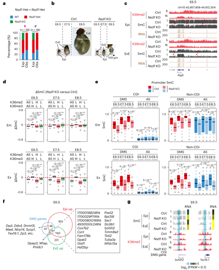 通過建立Nsd1催化失活突變小鼠模型,研究直接驗證了H3K36me2在體內(nèi)的功能。Nsd1敲除導(dǎo)致胚胎從E6.5起出現(xiàn)嚴(yán)重生長遲緩,E8.5前致死(圖5a-b)。H3K36me2在E6.5胚胎中整體丟失,主要影響非轉(zhuǎn)錄區(qū)域(圖5c)。WGBS分析顯示,突變體胚胎中H3K36me2富集區(qū)域的DNA甲基化在胚胎譜系中中度下降,但在胚外譜系中缺失顯著(圖5c-d)。而H3K36me3富集區(qū)域的DNA甲基化幾乎不受影響,提示DNMT3A/3B在H3K36me2缺失時被重定向至H3K36me3標(biāo)記區(qū)域。DNA甲基化缺失趨勢從E6.5到E8.5在胚胎譜系中逐漸減小,但在胚外譜系中加劇(圖5d),與兩種譜系中Dnmt3b表達(dá)差異相一致。上述研究結(jié)果表明在胚外譜系中,H3K36me2對植入后DNA甲基化建立至關(guān)重要。