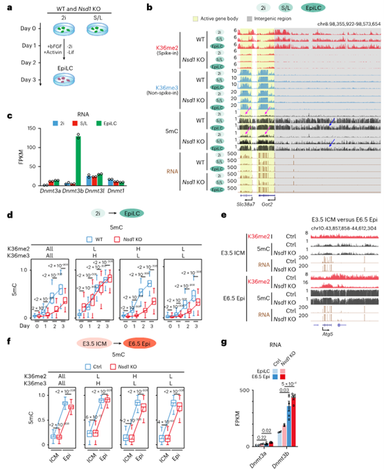 WGBS顯示,Nsd1敲除2i mES細(xì)胞中DNA甲基化水平極低,但主動基因體出現(xiàn)DNA甲基化增加(可能由于DNMT3A重定向);而在EpiLC分化過程中,Nsd1敲除細(xì)胞的DNA甲基化積累顯著延遲,尤其在H3K36me2富集區(qū)域(圖6b-d)。相比之下,從E3.5 ICM到E6.5 Epi的體內(nèi)發(fā)育中,Nsd1敲除的DNA甲基化缺失相對較輕(圖6e-f),可能與體內(nèi)Dnmt3a/3b表達(dá)水平更高有關(guān)(圖6g)。