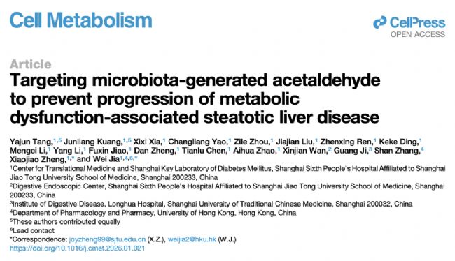 2026 年 3 月 2 日,上海交通大學醫(yī)學院附屬第六人民醫(yī)院轉化醫(yī)學中心與上海市糖尿病重點實驗室的賈偉教授、鄭曉皎教授團隊(唐雅珺、況俊良為論文共同第一作者),于 Cell Metabolism 期刊發(fā)表了題為“Targeting microbiota - generated acetaldehyde to prevent progression of metabolic dysfunction - associated steatotic liver disease”的研究論文。