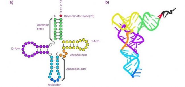 tRNA是長度70–90個核苷酸的 RNA,在蛋白合成過程中將mRNA密碼子翻譯成相應(yīng)氨基酸。每個tRNA都是典型的三葉草狀二級結(jié)構(gòu),隨后折疊成更緊湊的L形三級結(jié)構(gòu)。