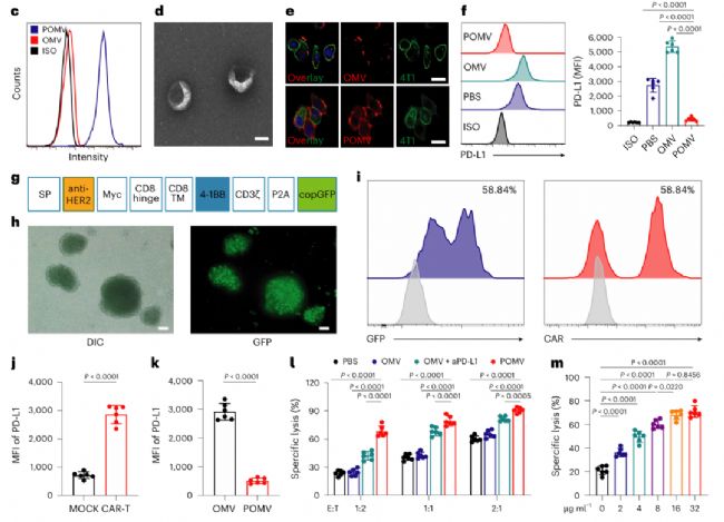 在這里,POMVs具有兩個(gè)作用。首先是OMVs通過(guò)激活先天免疫和阻斷PD-1/PD-L1軸重塑TME,增強(qiáng)CAR-T細(xì)胞浸潤(rùn)和效應(yīng)功能。其次,OMV可以將HER2編碼質(zhì)粒遞送至抗原陰性腫瘤細(xì)胞,使其膜表面表達(dá)HER2,從而被抗HER2 CAR-T細(xì)胞識(shí)別殺傷。