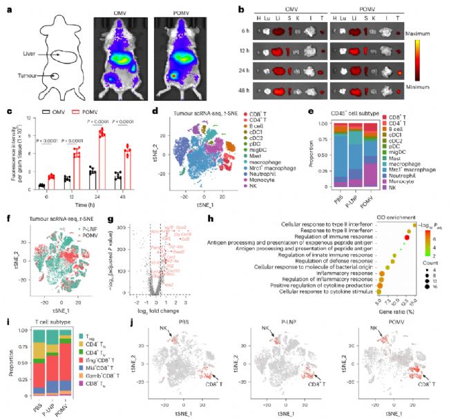 為了對(duì)比OMV載體和LNP載體的不同之處,他們做了POMV和P-LNP的對(duì)比。在差異基因GO富集分析中,發(fā)現(xiàn)富集到“抗原加工與呈遞”、“對(duì)II型干擾素的細(xì)胞響應(yīng)”、“先天免疫應(yīng)答調(diào)控”等條目,證實(shí)POMVs從功能層面系統(tǒng)性激活抗腫瘤免疫。