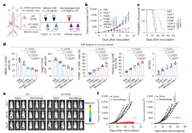 給模型小鼠皮下接種混合4T1腫瘤細(xì)胞(50% HER2陽(yáng)性 + 50%野生型)。他們的實(shí)驗(yàn)組BROAD-CAR-T組,腫瘤體積幾乎為零,說(shuō)明能夠完全控制腫瘤生長(zhǎng)。
