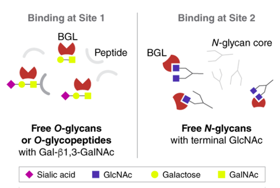 聚糖通常以糖蛋白或糖脂的形式存在于細(xì)胞上,它們分別與蛋白質(zhì)或脂質(zhì)共價結(jié)合。連接兩個單糖的鍵稱為糖苷鍵。聚糖主要通過兩種主要連接方式與蛋白質(zhì)相連,一種是聚糖通過天冬酰胺的側(cè)鏈氮與蛋白質(zhì)連接(N-連接聚糖),另一種是通過絲氨酸或蘇氨酸的側(cè)鏈氧連接(O-連接聚糖)。在N-連接糖基化的情況下,糖鏈一般與Asn-X-Thr/Ser(X是除脯氨酸外的任何氨基酸)基序的受體天冬酰胺結(jié)合。最常見的O-連接糖基化將單個單糖GalNAc(粘蛋白型糖基化)或GlcNAc(O-GlcNAc糖基化)與蛋白質(zhì)的絲氨酸或蘇氨酸結(jié)合,沒有比較固定的連接基序,并且在GalNAc的情況下,這種單糖會進一步延伸以形成各種核心聚糖結(jié)構(gòu)。
