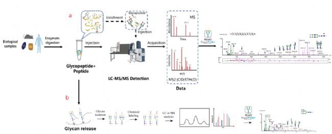 圖5 基于質(zhì)譜的糖蛋白質(zhì)組學(xué)(a)和糖組學(xué)(b)流程