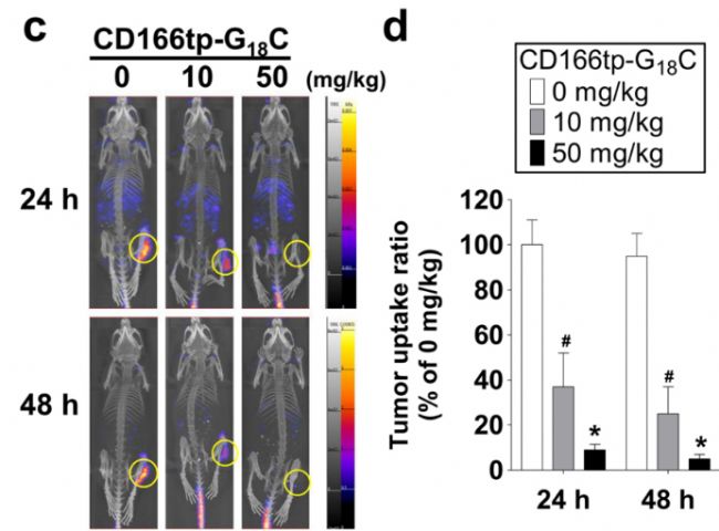 Fig. 8c(原文):展示競(jìng)爭(zhēng)性抑制實(shí)驗(yàn)的 SPECT/CT 顯像結(jié)果,體現(xiàn)設(shè)備對(duì)不同劑量未標(biāo)記探針干預(yù)下腫瘤攝取差異的捕捉能力。