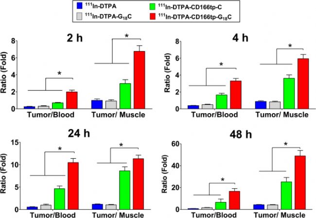 Fig. 10(原文):呈現(xiàn)不同時(shí)間點(diǎn)各探針的腫瘤 / 血液、腫瘤 / 肌肉比值,為 ¹¹¹In-DTPA-CD166tp-G₁₈C 探針的優(yōu)異顯像性能提供量化依據(jù),支撐其作為 CRCSCs 顯像劑的結(jié)論。