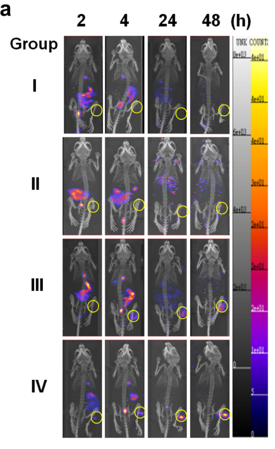 Fig. 8a(原文):展示 CD166⁺結(jié)直腸癌異種移植小鼠經(jīng)不同探針注射后 2、4、24、48 小時(shí)的 SPECT/CT 顯像圖