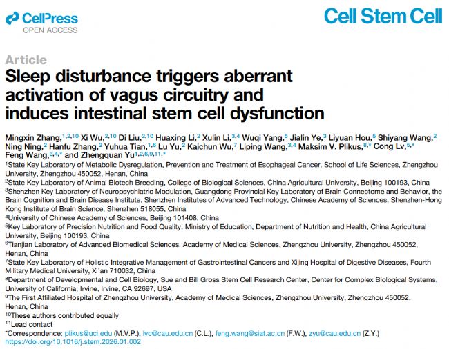 由鄭州大學(xué)等機(jī)構(gòu)團(tuán)隊(duì)完成,發(fā)表于《Cell Stem Cell》2026年2月刊,首次揭示了睡眠障礙從大腦向腸道傳遞異常神經(jīng)信號、誘導(dǎo)腸道干細(xì)胞(ISC)功能障礙的分子機(jī)制與神經(jīng)環(huán)路,為睡眠相關(guān)胃腸疾病提供了全新治療靶點(diǎn)。