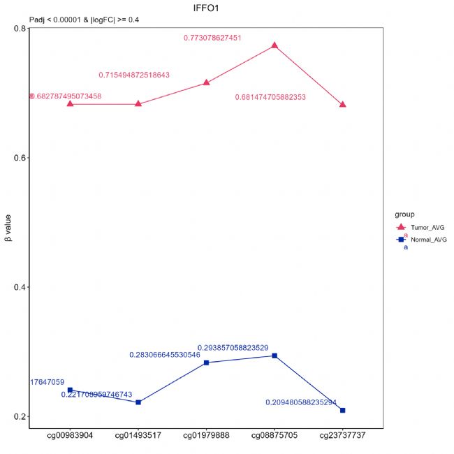 labs(x="",y="β value", title = "IFFO1", subtitle = "Padj < 0.00001 & |logFC| >= 0.4") +