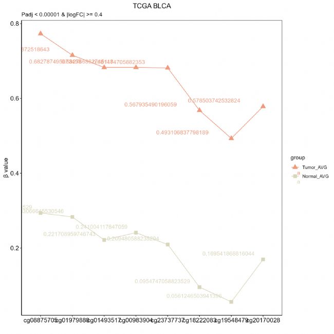 ##對膀胱癌中差異上調(diào)的cg進(jìn)行繪制均值的折線圖
