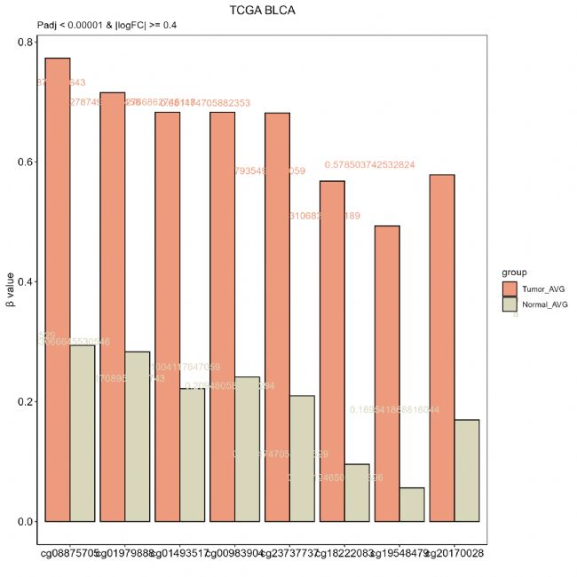 labs(x="",y="β value", title = "TCGA BLCA", subtitle = "Padj < 0.00001 & |logFC| >= 0.4") +