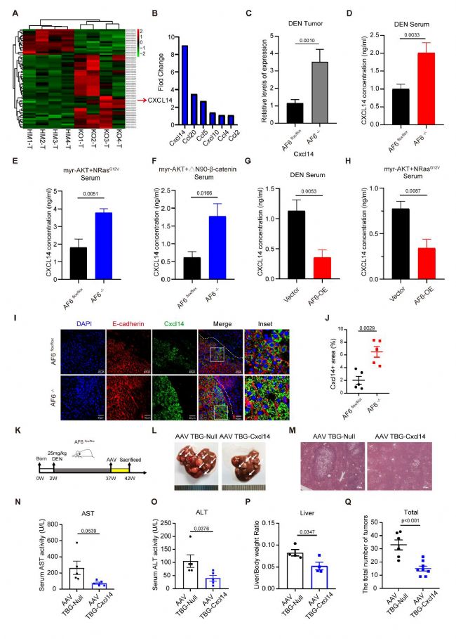作者重新分析AF6敲除肝癌小鼠的轉(zhuǎn)錄組數(shù)據(jù),發(fā)現(xiàn)免疫相關(guān)通路顯著激活,其中趨化因子編碼基因CXCL14的上調(diào)幅度最為顯著,qPCR與ELISA實(shí)驗(yàn)驗(yàn)證了AF6⁻/⁻小鼠腫瘤組織中CXCL14 mRNA高表達(dá),且血清中CXCL14蛋白濃度顯著升高,該結(jié)果在多種肝癌模型中均一致,而過表達(dá)AF6則會(huì)抑制CXCL14的表達(dá),免疫熒光顯示CXCL14在AF6⁻/⁻小鼠腫瘤邊緣富集。為驗(yàn)證CXCL14的功能,作者通過腺相關(guān)病毒(AAV-TBG-Cxcl14)在AF6 flox/flox肝癌小鼠中肝特異性過表達(dá)CXCL14,結(jié)果顯示腫瘤負(fù)荷顯著降低,腫瘤數(shù)量與肝重比明顯下降;而敲除AF6⁻/⁻小鼠的CXCL14會(huì)逆轉(zhuǎn)AF6敲除的抑瘤效應(yīng),加速肝癌進(jìn)展,表明CXCL14是受AF6負(fù)調(diào)控、介導(dǎo)肝癌抑制的關(guān)鍵抑瘤性趨化因子。此外,給予AF6flox/flox肝癌小鼠1%T-CA飲食可模擬AF6敲除的表型,顯著抑制腫瘤進(jìn)展并上調(diào)血清與腫瘤組織中的CXCL14,表明AF6調(diào)控的T-CA是CXCL14上調(diào)的重要上游信號(hào)。