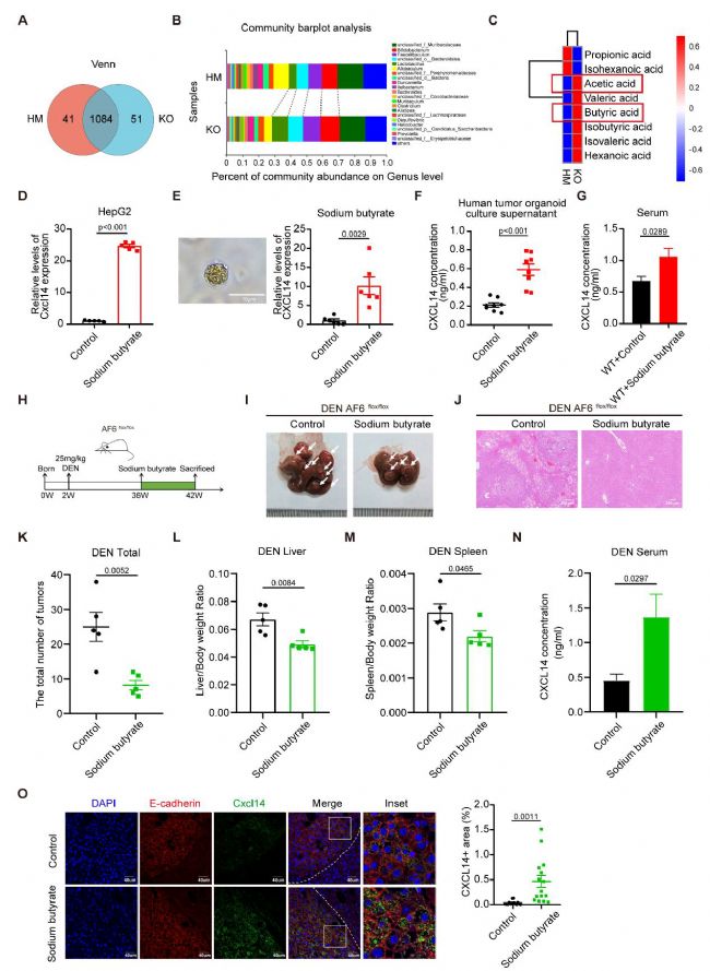 體外實(shí)驗(yàn)中,用T-CA、β-MCA等關(guān)鍵初級(jí)膽汁酸處理肝癌細(xì)胞系及患者來源肝癌類器官,并未直接誘導(dǎo)CXCL14表達(dá),提示膽汁酸并非通過直接作用調(diào)控CXCL14。宏基因組測序顯示,AF6⁻/⁻肝癌小鼠腸道菌群組成發(fā)生顯著改變,雙歧桿菌、糞桿菌、擬桿菌、乳桿菌等短鏈脂肪酸(SCFA)產(chǎn)生菌屬顯著富集,靶向代謝組學(xué)檢測到小鼠肝臟中乙酸、丁酸等短鏈脂肪酸水平大幅升高。同時(shí),AF6敲除后回腸與肝臟中ASBT、NTCP等膽汁酸轉(zhuǎn)運(yùn)體的表達(dá)上調(diào),增強(qiáng)了腸肝循環(huán),過表達(dá)AF6則會(huì)降低丁酸水平并抑制轉(zhuǎn)運(yùn)體表達(dá),T-CA飲食可模擬AF6敲除的菌群與代謝物變化。體外功能實(shí)驗(yàn)證實(shí),丁酸可顯著上調(diào)肝癌細(xì)胞系及人、鼠肝癌類器官中CXCL14的mRNA與蛋白分泌水平,而乙酸、丙酸無此效應(yīng);體內(nèi)實(shí)驗(yàn)中,給野生型小鼠補(bǔ)充丁酸可使血清中的CXCL14升高,給肝癌小鼠補(bǔ)充丁酸則顯著抑制腫瘤進(jìn)展,同時(shí)上調(diào)血清與肝臟CXCL14水平,證實(shí)膽汁酸通過重塑腸道菌群提升丁酸水平,丁酸是經(jīng)腸肝軸介導(dǎo)CXCL14上調(diào)的關(guān)鍵中介。