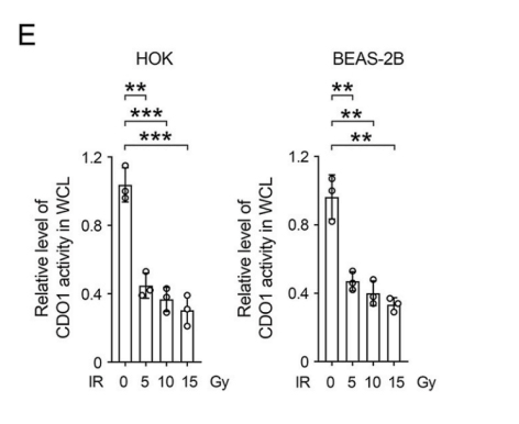 原文 Figure 1E:呈現(xiàn)不同輻射劑量下 CDO1 酶活性變化,直觀印證輻照儀誘導的劑量依賴性 CDO1 活性抑制,為模型有效性提供關鍵數(shù)據(jù)。