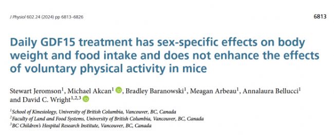 實(shí)驗(yàn)選用 10-12 周齡 C57BL/6J 雌雄小鼠,經(jīng) 3 周高脂飲食喂養(yǎng)構(gòu)建肥胖模型。小鼠隨機(jī)分為對(duì)照組(生理鹽水)和 GDF15 組(每日皮下注射 0.1 mg/kg 重組人 GDF15),每組再細(xì)分久坐(Sed)和 VWR 亞組,干預(yù)持續(xù) 11 天。研究過(guò)程中每日監(jiān)測(cè)攝食量、跑步距離,干預(yù)前后采用 EchoMRI 體成分分析儀檢測(cè)脂肪量、瘦體重,同時(shí)通過(guò)口服葡萄糖耐量試驗(yàn)及血清代謝指標(biāo)檢測(cè)評(píng)估代謝健康。