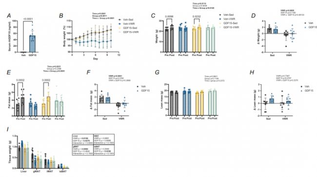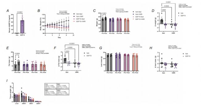 原文圖 2:清晰呈現(xiàn) GDF15 和 VWR 對(duì)雄性小鼠體重、脂肪量、瘦體重的影響,證實(shí) GDF15 的減脂效應(yīng)。