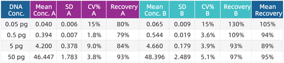 準(zhǔn)確性與可重復(fù)性測試。由兩名操作員(A和B)分別在兩天內(nèi)對已知DNA樣本進行兩次檢測,計算檢測結(jié)果的SD, CV和回收率%(見下表)。