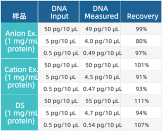 過程樣品與藥物原液(DS)檢測結(jié)果對比。對比含有1 mg/mL陰離子交換或陽離子交換純化的蛋白樣品或藥物蛋白的CHO DNA回收率(見下表)。