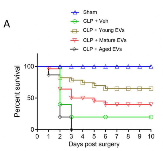 原文Fig. 3A:不同年齡組小鼠來源 EVs 處理后,膿毒癥小鼠的 10 天 Kaplan-Meier 生存曲線
