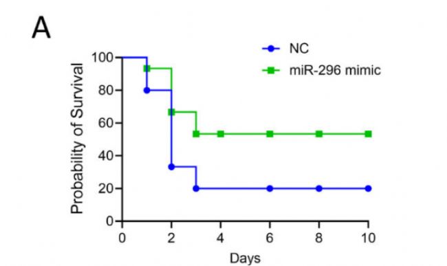 原文Fig. 8A:腹腔注射 miR-296-5p 模擬物與陰性對照后,膿毒癥小鼠的生存曲線對比