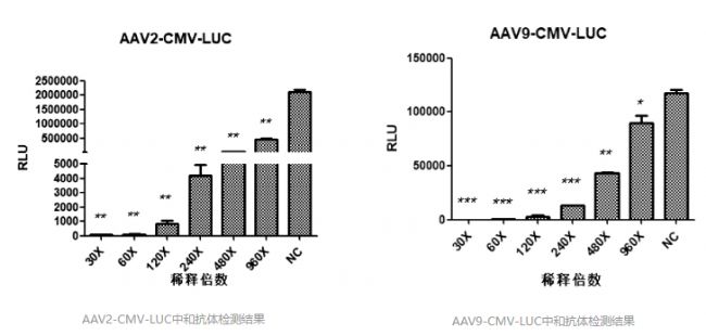 將待測樣品按以下梯度進行稀釋:30X、60X、120X、240X、 480X、960X,每個梯度取10μL分別與10μL不同血清型的AAV病毒共同孵育,孵育完成后將混合液感染293T細(xì)胞,感染24h后用酶標(biāo)儀檢測RLU發(fā)光值。綜合以上,在血清1:60稀釋時,無論AAV2還是AAV9抑制率均能接近100%。