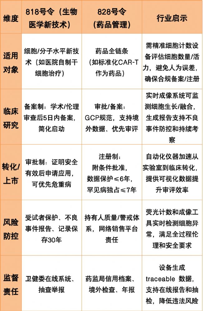 兩大法規(guī)堅(jiān)持“人民健康為中心、創(chuàng)新引領(lǐng)與風(fēng)險(xiǎn)防控并重”的原則,形成“技術(shù)-藥品”雙軌監(jiān)管體系。通過界定指導(dǎo)原則銜接,避免監(jiān)管沖突,確保倫理合規(guī)。簡單說,818號(hào)令像“快車道”,便于技術(shù)快速落地;828號(hào)令則像“高速公路”,支持產(chǎn)品規(guī);虡I(yè)化。從應(yīng)用角度看,這些法規(guī)強(qiáng)化了非臨床/臨床研究的數(shù)據(jù)準(zhǔn)確性和實(shí)時(shí)監(jiān)測要求,例如細(xì)胞活力評估和不良事件跟蹤,這直接推動(dòng)了自動(dòng)化儀器在實(shí)驗(yàn)室和臨床中的應(yīng)用,幫助企業(yè)實(shí)現(xiàn)精準(zhǔn)質(zhì)控和高效轉(zhuǎn)化。