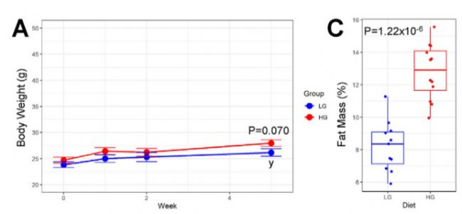 原文圖 2A、C(年輕小鼠體脂百分比對(duì)比):年輕小鼠 HG 組與 LG 組的體脂差異,證實(shí) HG 飲食的致肥胖效應(yīng)。
