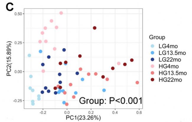原文圖 3C(菌群 β 多樣性主坐標(biāo)分析):不同年齡、飲食組小鼠的菌群聚類差異,年輕小鼠飲食分組聚類更清晰