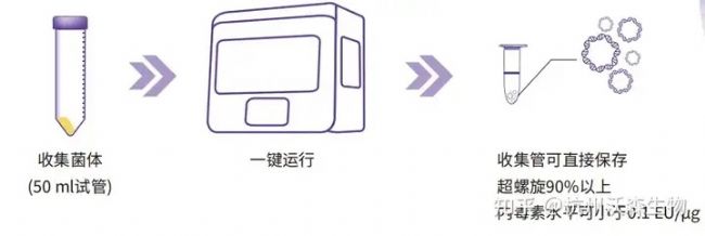 可自動化提取50~150 ml菌液樣本的質(zhì)粒,并實現(xiàn)內(nèi)毒素的高效去除,該平臺還可實現(xiàn)蛋白自動化純化。