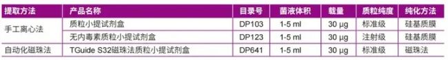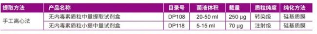 搭配不同的配套試劑可獲得高純度質(zhì)粒或低內(nèi)毒素的轉(zhuǎn)染級質(zhì)粒。