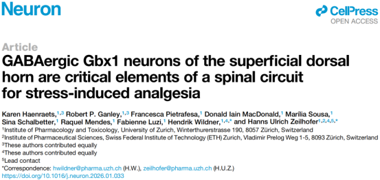 參考文獻(xiàn):Haenraets et al., GABAergic Gbx1 neurons of the superficial dorsal horn are critical elements of a spinal circuit for stress-induced analgesia, Neuron (2026),