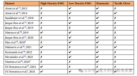 當(dāng)前公開的數(shù)據(jù)集多集中于單一或兩種信號類型,缺乏同時包含高密度肌電(HD-sEMG)、雙極肌電、運動捕捉(MoCap)、傳感器手套(包括彎曲與觸覺數(shù)據(jù))的多模態(tài)數(shù)據(jù)集(見表1)。這種數(shù)據(jù)缺失限制了多源信息融合方法的研究,尤其是在假肢控制領(lǐng)域中,如何融合多種信號以提高控制精度和魯棒性仍是一個挑戰(zhàn)。