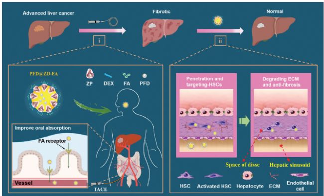經(jīng)動脈化療栓塞術(shù)(TACE)是中晚期肝癌的主流療法,然而其療效是一把“雙刃劍”:在控制腫瘤的同時,會不可避免地加重患者肝纖維化,嚴(yán)重影響長期預(yù)后?估w維化藥物吡非尼酮(PFD)雖有效,但因其口服生物利用度低、所需劑量高導(dǎo)致的全身性副作用,限制了其臨床應(yīng)用。