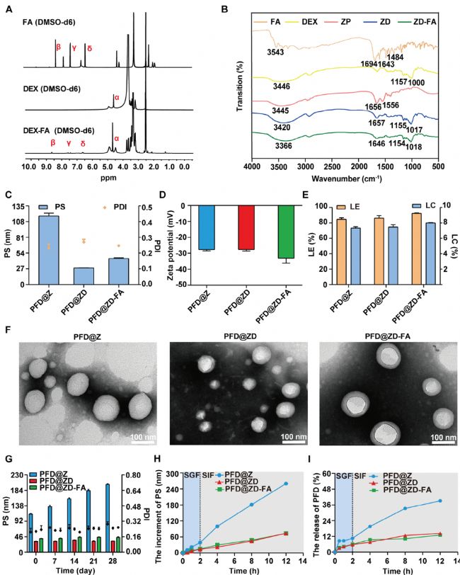 理化性質(zhì)優(yōu)異:PFD@ZD-FA粒徑均一(≈45 nm),載藥效率高(>80%),并在模擬胃腸液中表現(xiàn)出卓越的穩(wěn)定性,實現(xiàn)了藥物的緩釋。