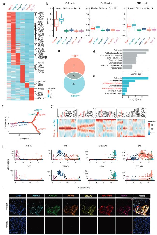 研究針對不同譜系 PitNET 逐一解析其腫瘤異質(zhì)性,聚焦 TPIT 譜系的 16 個腫瘤細胞簇,通過層級聚類鑒定出 6 個亞群(圖 3a)。其中 ACTH⁽ᴬᵍᵍ⁾亞群為典型的侵襲性特征簇,高表達 CASC5、GTSE1 等 82 個與腫瘤侵襲相關(guān)的基因,p53 和 FoxO 通路活性顯著增強,細胞周期、增殖及 DNA 修復(fù)能力遠高于其他亞群(圖 3b-3e)。利用 Monocle 2 構(gòu)建的發(fā)育軌跡顯示,TPIT 譜系腫瘤以 SCA⁽ᴿᵉᵍ⁾為分化起點,ACTH⁽ᴬᵍᵍ⁾處于分化軌跡的末端,與腫瘤進展密切相關(guān)(圖 3f)。該侵襲性亞群主要來自攜帶 TP53 Arg248Gln 熱點突變的患者,其 Ki67 陽性率達 8%、Trouillas 分級為 2b 級,無進展生存期僅 15 個月,遠短于其他 ACTH 腫瘤患者(圖 4a-4j)。單細胞轉(zhuǎn)錄組分析還發(fā)現(xiàn),部分 SCA、ACTH 腫瘤存在轉(zhuǎn)錄組表型與臨床診斷不符的情況,如 SCA1 樣本部分簇高表達 ACTH 特異性基因(圖 2d-2e),揭示了 PitNET 高度的內(nèi)在異質(zhì)性,也證實了分子分型對腫瘤精準表征的重要性。