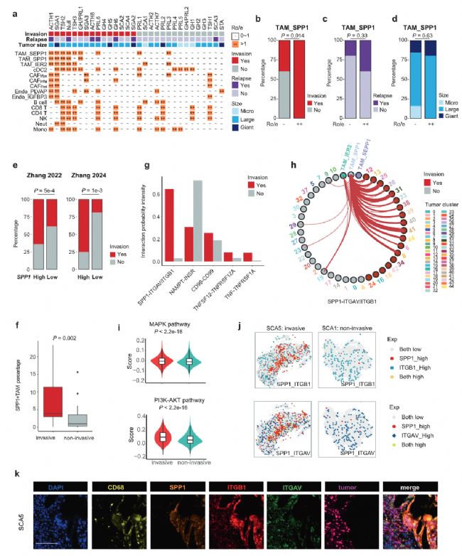 腫瘤微環(huán)境是調(diào)控 PitNET 侵襲的核心,研究對 PitNET 的免疫基質(zhì)細胞進行系統(tǒng)解析,從 12267 個細胞中鑒定出 16 個免疫基質(zhì)細胞簇,包括 3 類腫瘤相關(guān)巨噬細胞(TAM)、3 類癌相關(guān)成纖維細胞(CAF)及 2 類內(nèi)皮細胞(圖 5a-5b)。其中 SPP1+TAM 為特征性巨噬細胞亞型,高表達 OLR1、PLIN2 等基因,PPAR、TNF 信號通路顯著富集,且與 CAFs 存在明顯的空間共定位(圖 5c-5i)。臨床樣本分析發(fā)現(xiàn),SPP1+TAM 在侵襲性 PitNET 中顯著富集,且與腫瘤大小、復(fù)發(fā)狀態(tài)及亞型無關(guān)(圖 6a-6f),這一結(jié)果在外部批量測序數(shù)據(jù)中也得到驗證。機制研究證實,SPP1+TAM 通過 SPP1-ITGAV/ITGB1 配體 - 受體通路與腫瘤細胞相互作用,激活下游 MAPK、PI3K/Akt 通路,促進腫瘤細胞的增殖與侵襲(圖 6g-6k)。體外實驗進一步驗證,外源性 SPP1 可顯著增強 PitNET 細胞系的增殖、遷移能力,而敲低 ITGB1 則能完全逆轉(zhuǎn)該促腫瘤效應(yīng),明確了 SPP1-ITGAV/ITGB1 通路是調(diào)控 PitNET 侵襲的核心分子通路。
