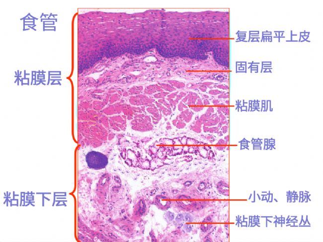 富含彈性纖維、食管腺(黏液腺)及血管神經(jīng),黏液腺分泌黏液潤(rùn)滑食管腔,減少食物對(duì)管壁的摩擦。