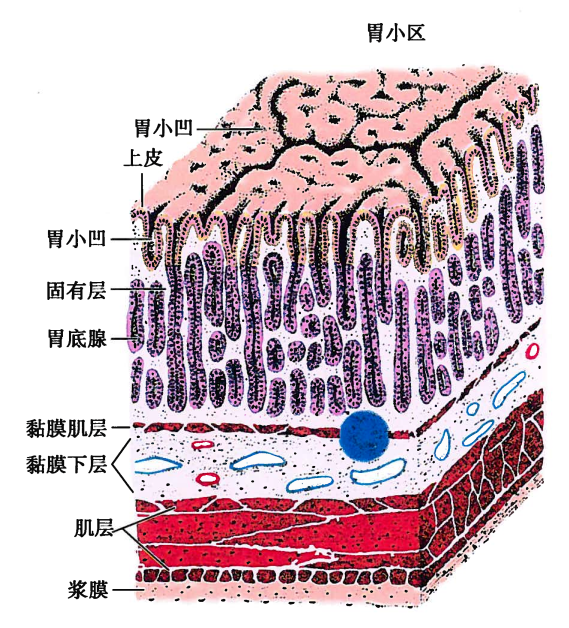 胃壁由內(nèi)向外同樣分為 4 層,核心結(jié)構(gòu)集中于黏膜層: