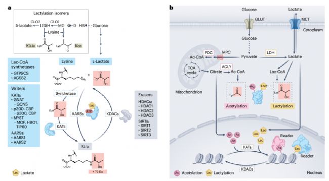乳酸化(lactylation)是乳酸衍生的賴氨酸翻譯后修飾,以乳酰輔酶 A 為核心酰基供體,經(jīng)酶促 / 非酶促途徑共價(jià)修飾蛋白賴氨酸殘基,由 “writer-eraser-reader” 系統(tǒng)動態(tài)調(diào)控,將乳酰基團(tuán)轉(zhuǎn)移到蛋白質(zhì)的氨基酸殘基上。