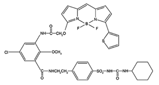 ER-Tracker Red為采用Molecular Probes公司的BODIPY TR進(jìn)行了熒光標(biāo)記的glibenclamide。Glibenclamide即glyburide,中文名為格列苯脲,是一種2型糖尿病治療藥物,可以結(jié)合主要定位在內(nèi)質(zhì)網(wǎng)上的包含ATP敏感的鉀離子通道(KATP channel)的磺脲類(sulphonylurea)受體。因此熒光標(biāo)記的glibenclamide就可以用作內(nèi)質(zhì)網(wǎng)特異性的熒光探針。ER-Tracker Red適用于活細(xì)胞內(nèi)質(zhì)網(wǎng)的熒光染色,但不適合用于固定細(xì)胞內(nèi)質(zhì)網(wǎng)的熒光染色。