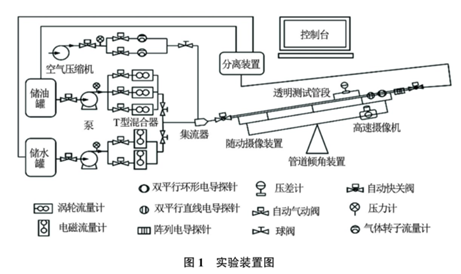 實驗過程中通過控制系統(tǒng)設(shè)定管道傾角,給定油水兩相混合流量以及含水率,由計算機和自動控制系統(tǒng)進(jìn)行流動控制。油水兩相分層流動特征采用高速攝像系統(tǒng)進(jìn)行數(shù)據(jù)采集,試驗測試段總壓降使用差壓計測量和記錄,管道截面持油率利用快關(guān)閥技術(shù)進(jìn)行采集得到。