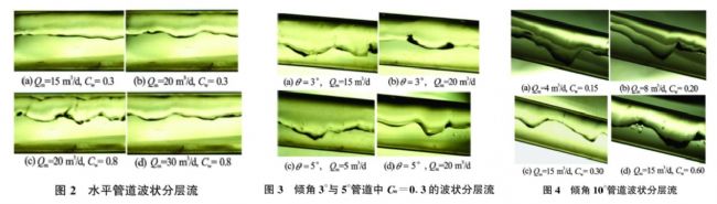 分層流是水平和傾斜管道中兩相流的基本流型,而波狀分層流由于界面發(fā)生波動而產(chǎn)生界面波增加流動的復(fù)雜性。油水兩相流實驗研究表明,油水兩相流管道從水平變成傾斜時,油水兩相分層流達(dá)到的最大流速減小,油水界面變得更加起伏和不規(guī)則。