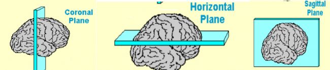 腦組織的切面多種多樣,最常用的有冠狀面(coronal)、矢狀面(sagittal)和水平面(horizontal)。