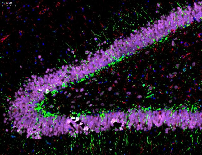 小鼠腦海馬區(qū)mIHC染色(粉NeuN+綠GFAP+紅IBA1)