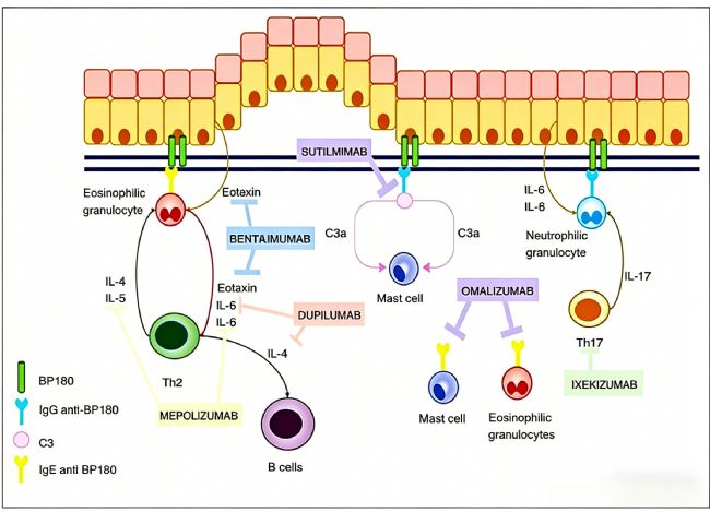 大皰性類天皰瘡(BP)、黏膜類天皰瘡(MMP)及尋常型天皰瘡(PV)是皮膚科常見的自身免疫性大皰病,其發(fā)病機制涉及自身抗體攻擊皮膚基底膜區(qū)(如BP180、BP230)或橋粒核心蛋白(如橋粒芯蛋白3/1)。傳統(tǒng)治療依賴糖皮質(zhì)激素及免疫抑制劑(如霉酚酸酯、環(huán)磷酰胺),雖可控制病情但長期應用帶來顯著副作用,尤其對于老年及合并癥患者,感染風險及死亡率增加。因此,開發(fā)靶向致病機制的選擇性治療策略成為臨床迫切需求。