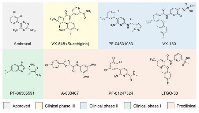 Nav1.8獨特電生理特性使其在疼痛信號傳導中發(fā)揮關鍵作用,是非成癮性鎮(zhèn)痛藥物開發(fā)的重要靶點。下圖為代表性Nav1.8抑制劑。